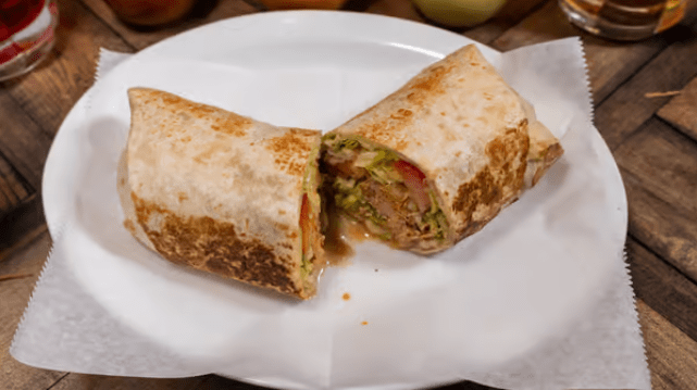 On a flour tortilla w/ beans, Lettuce, tomato, cheese, sour cream & avocado